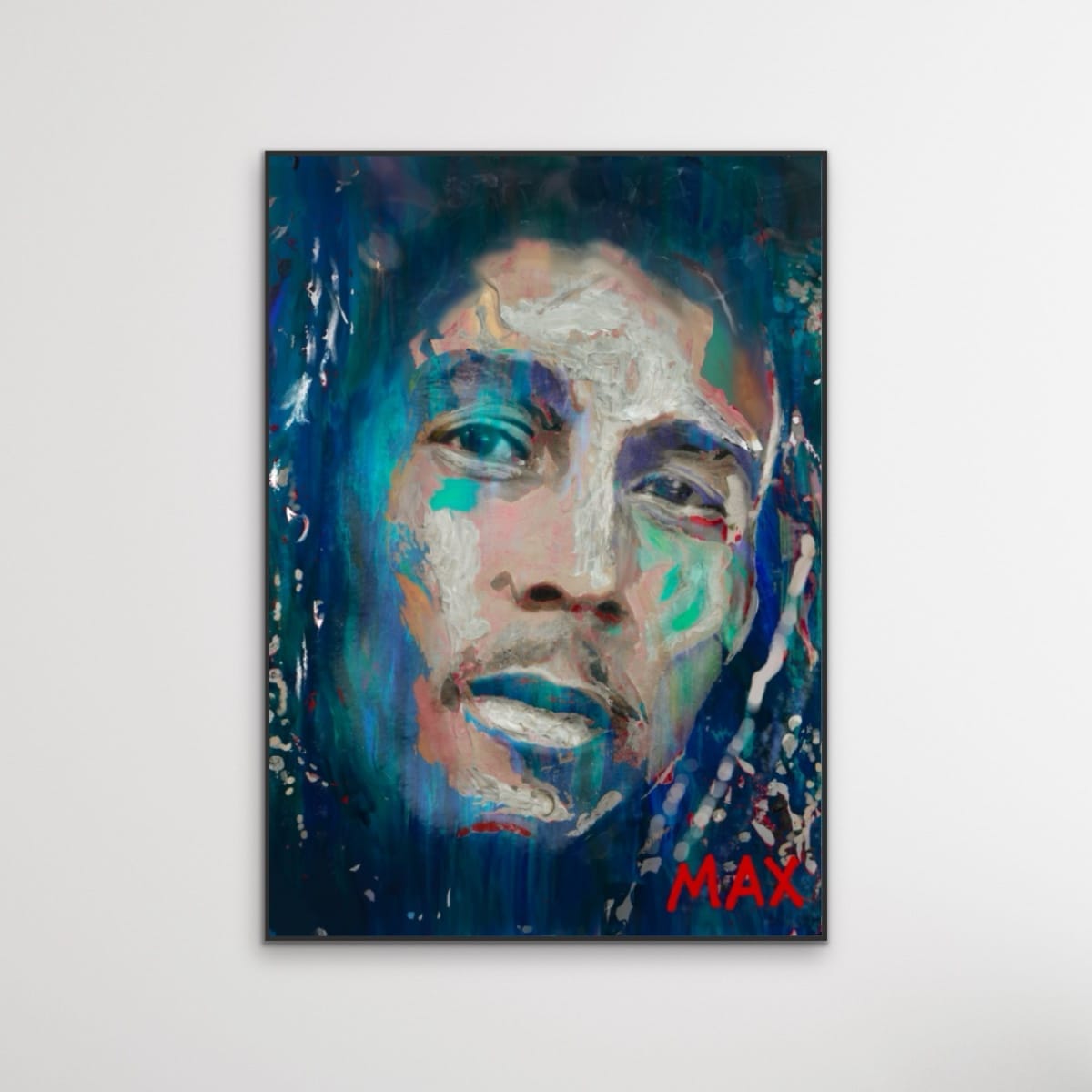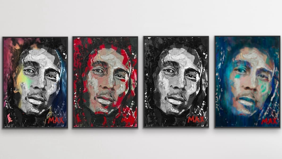 Featuring my signature portraiture style, each artwork combines acrylic painting with hand-drawn digital techniques, resulting in a bold color palette and abstract design that pays homage to Bob Marley.
